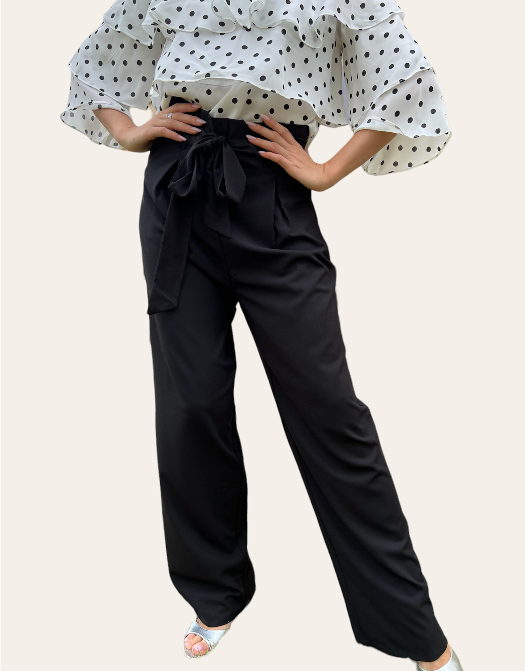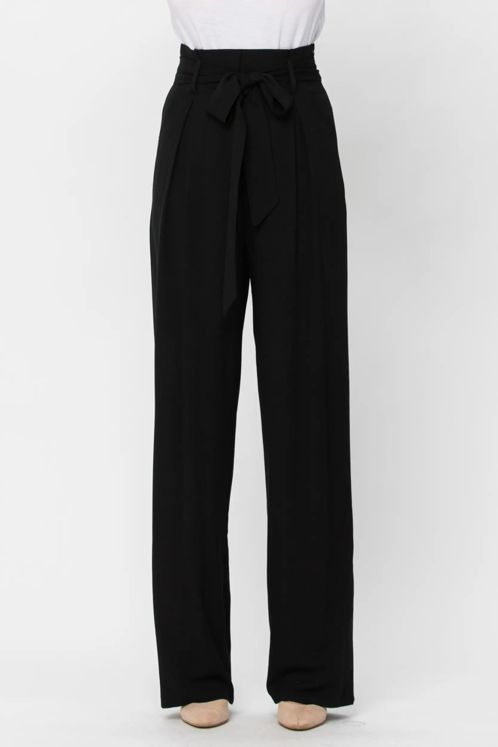 Belted black paper bag high waist pants with side pockets and tie.